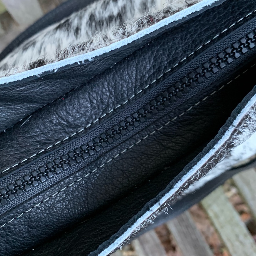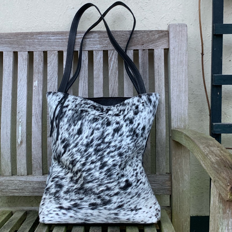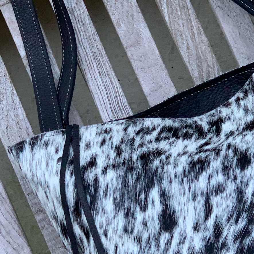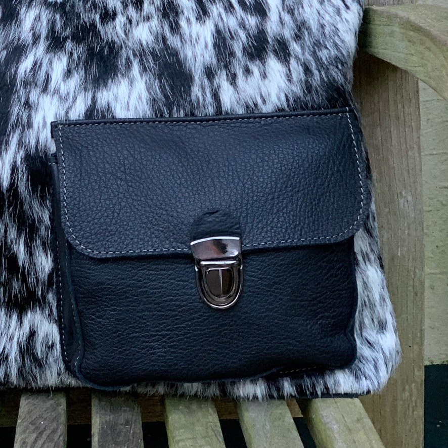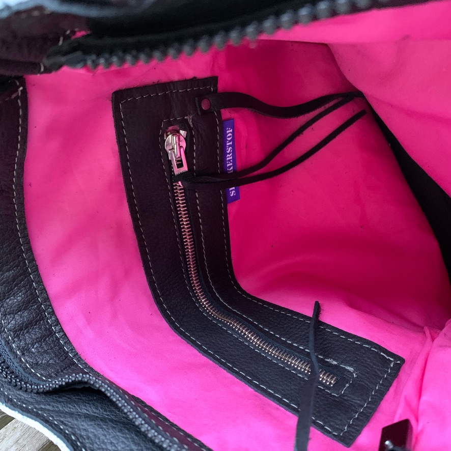 Een hele fijne zachte zogenaamde tote-bag. Hij is gemaakt van koeienvel en voelt dus heel zacht aan. Op de tas zit een hele grote zwarte “zak” vandaar dus de naam zakkentas. Zakentas mag ook want er past makkelijk een lap-top in! Binnenin knalt een roze voering je tegemoet, een leuke tegenhanger van de rustige buiten kleur. Natuurlijk met een afsluitbaar binnenvak en een sleutelkoord.